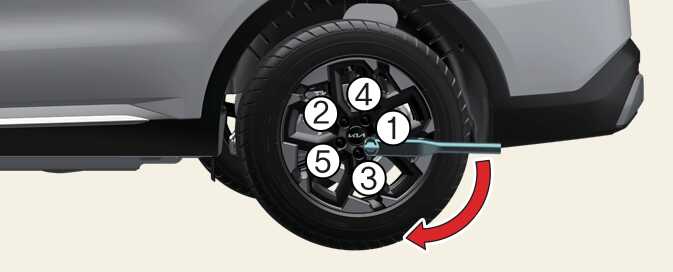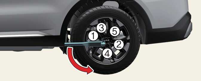 OMQ4063042LPosition the wrench as shown in the drawing and tighten the wheel nuts. Be sure the socket is seated completely over the nut. Do not stand on the wrench handle or use an extension pipe over the wrench handle. Go around the wheel tightening every other nut until they are all tight. Double-check each nut for tightness. After changing wheels, have an authorized Kia dealer tighten the wheel nuts to their proper torque as soon as possible.
