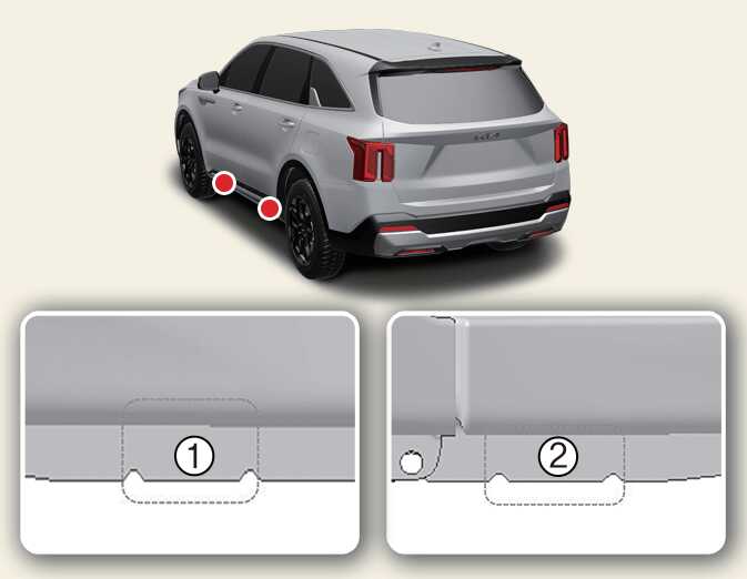 Place the jack at the front (1) or rear (2) jacking position closest to the tire you are changing. Place the jack at the designated locations under the frame. The jacking positions are plates welded to the frame with two tabs and a raised dot.