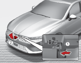 Go to the front of the vehicle, raise the hood slightly, push the secondary latch (1) to the left and lift the hood (2).