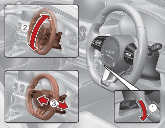 To change the steering wheel angle, pull down the lock release lever (1), adjust the steering wheel to the desired angle (2) and height (3), then pull up the lock-release lever to lock the steering wheel in place. Be sure to adjust the steering wheel to the desired position before driving.