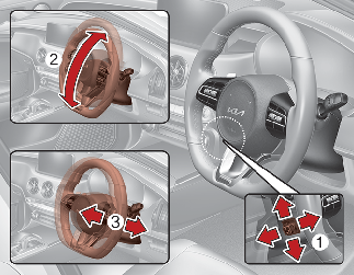Adjust the steering wheel angle (2) and position (3) with the switch (1). Never adjust the position of the steering wheel whilst driving.