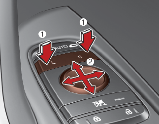 The electric remote control mirror switch allows you to adjust the position of the left and right outside rearview mirrors. To adjust the position of either mirror, press the R or L button (1) to select the right side mirror or the left side mirror, then press a corresponding point (▲) on the mirror adjustment control (2) to position the selected mirror up, down, left or right.