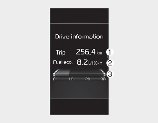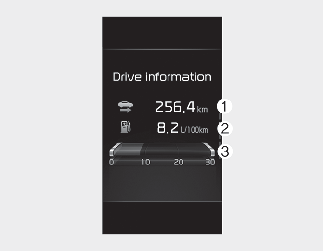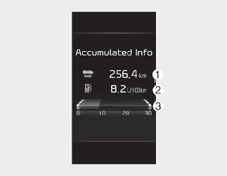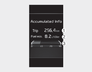 This display shows the trip distance (1), the average fuel efficiency (2), and the instant fuel economy (3) information once per one ignition cycle.