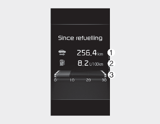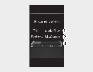 This display shows the accumulated trip distance (1), the average fuel efficiency (2), and the instant fuel economy (3) after refuelling.