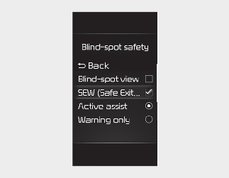 With the ENGINE START/STOP button in the ON position, and select 'User Settings (LCD display) or Settings → Vehicle (Infotainment System screen) → Driver Assistance → Blind-Spot Safety → Safe Exit Warning' to turn on Safe Exit Warning and deselect to turn off.