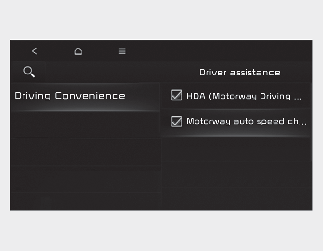 "Driver Assistance → Driving Convenience → Motorway auto speed change" from the Settings → Vehicle to turn on Navigation-based Smart Cruise Control and deselect to turn off the function.