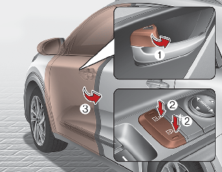 För att lösa en dörr utan nyckeln trycker du på låsknappen (1) på insidan av dörren (2) så den är i läget "Lås" och stänger dörren (3).