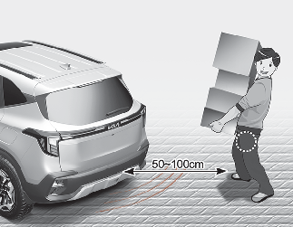 If you are positioned in the detecting area (50 ~ 100 cm (20 ~ 40 inches) behind the vehicle) carrying a smart key, the hazard warning lights will blink and chime will sound for about 3 seconds to alert you the smart key has been detected and the tailgate will open.