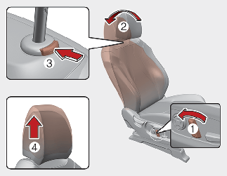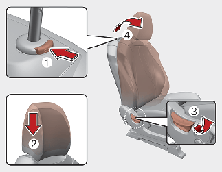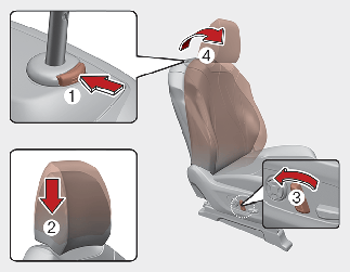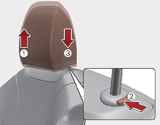 To lower the headrest, push and hold the release button (2) on the headrest support.
