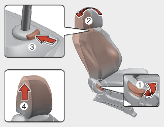 For maximum effectiveness in case of an accident, the headrest should be adjusted so the middle of the headrest is at the same height of the centre of gravity of an occupant's head. Generally, the centre of gravity of most people's head is similar with the height of the top of their eyes. Also, adjust the headrest as close to your head as possible. For this reason, the use of a cushion that holds the body away from the seatback is not recommended.