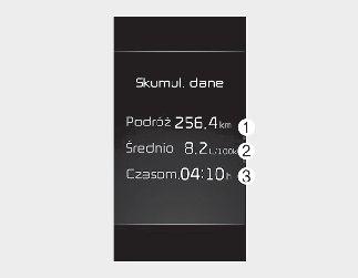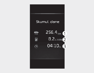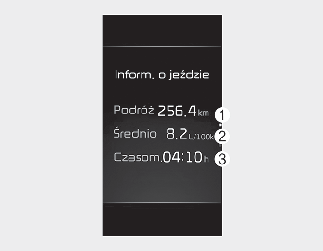 Na tym ekranie są wyświetlane odległość podróży (1), średnie spalanie (2) i całkowity czas jazdy (3) dla każdego cyklu zapłonu.