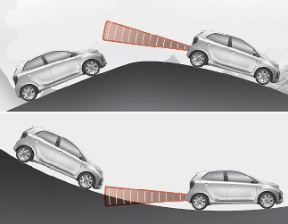 System monitorowania martwego pola może działać nieprawidłowo podczas jazdy w miejscu, w którym występuje różnica wysokości między pasami ruchu. System monitorowania martwego pola może nie wykrywać pojazdu na drodze, na której występuje różnica wysokości między pasami ruchu (droga dojazdowa biegnąca z tunelu, skrzyżowania wielopoziomowe itp.).