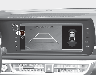 عندما تلمس الأيقونة (1)، يتم عرض الرؤية العلوية على الشاشة وتظهر المسافة بين سيارتك والسيارة الموجودة خلفها أثناء الركن.