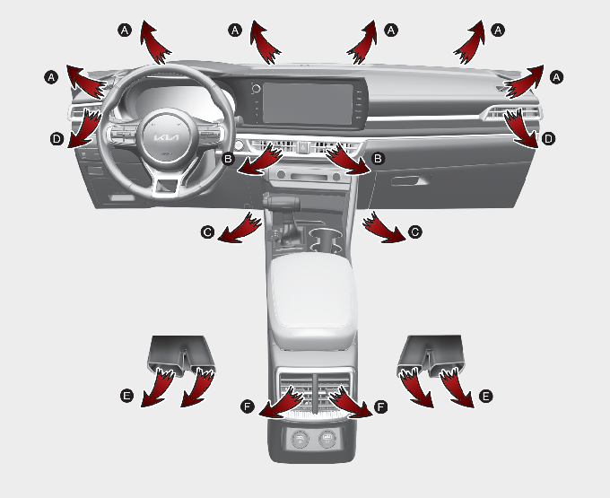 حيث يتم توجيه معظم تدفق الهواء إلى الأرضية، مع توجيه كمية صغيرة من الهواء إلى الزجاج الأمامي والنوافذ الجانبية ومزيلات صقيع النوافذ الجانبية وفتحات الهواء الجانبية.