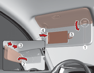 لاستخدام مرآة الزينة، اسحب حاجب الشمس لأسفل وحرِّك غطاء المرآة (٤).