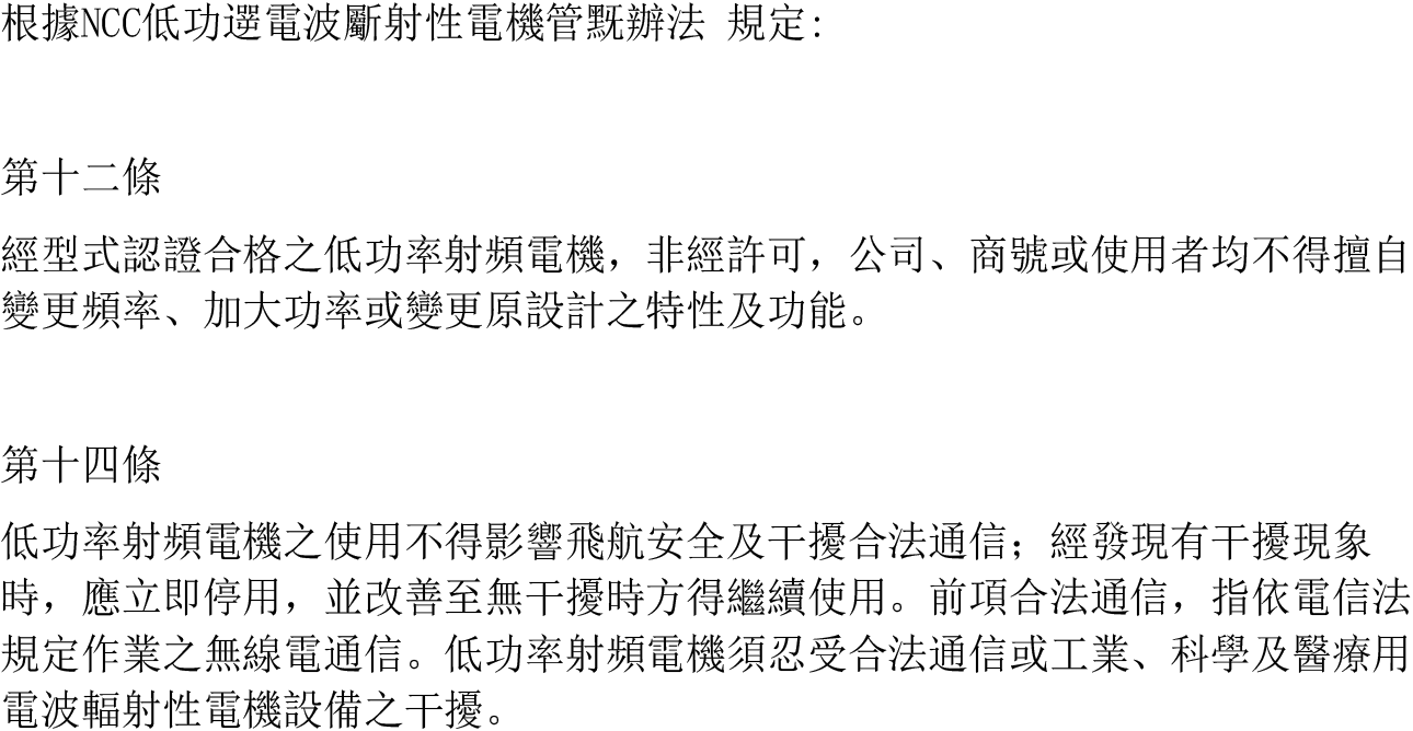 وفقًا للوائح الفنية الخاصة بأجهزة التردد اللاسلكي منخفضة الطاقة التابعة للجنة الاتصالات الوطنية (NCC): المادة 12، لا يجوز لأي شركة أو مؤسسة أو مستخدم تغيير التردد أو زيادة الطاقة أو تغيير خصائص ووظائف التصميم الأصلي للجهاز الكهربائي ذي التردد المنخفض المعتمد، دون الحصول على إذن. المادة 14، يجب ألا يؤثر استخدام الأجهزة الكهربائية ذات التردد المنخفض على سلامة الملاحة وألا يتداخل مع أي اتصال قانوني، إذا تم العثور على تداخل، سيتم تعليق الخدمة حتى يتم التحسين وينعدم التداخل.