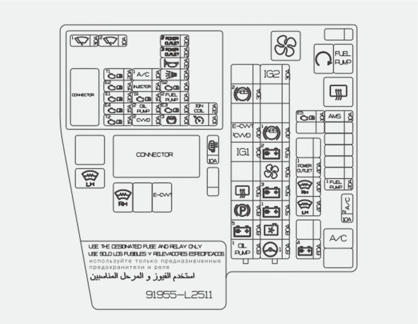 مجموعة توصيل غرفة المحرك (مرحل الزجاج المسخن لتدفئة المقعد على الجانب الأيسر/الأيمن)، محرك بمروحة تبريد، وحدة التحكم الإلكترونية للركن بمساعدة أنظمة مساعدة السائق المتقدمة، وحدة التحكم في استرخاء مقعد الراكب، وحدة التحكم في جهاز تدفئة المقعد الأمامي، وحدة التحكم في مقعد التهوية الأمامي، وحدة التحكم في جهاز تدفئة المقعد الخلفي |