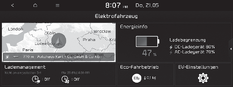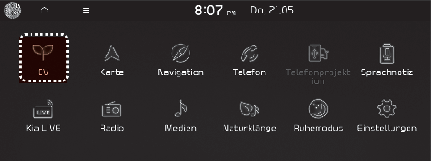 * Das Bild auf dem Bildschirm EV Menü in dieser Anleitung kann von der tatsächlichen Anzeige abweichen, je nach den technischen Daten des Fahrzeugs und der Version der Multimedia-Systemsoftware. Weitere Informationen finden Sie im ‚BENUTZERHANDBUCH DES MULTIMEDIA-SYSTEMS DES FAHRZEUGS‘.