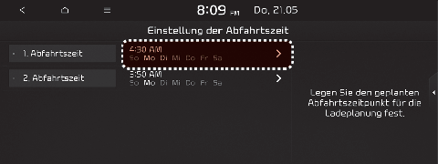 Abfahrtszeit: Stellen Sie die Zeit ein, zu der Sie das Fahrzeug nach dem Laden der Batterie starten wollen.