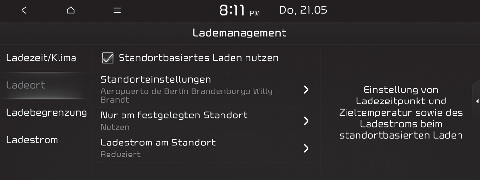 Mit der Funktion für die standortabhängige Aufladung können Sie Ladestromeinstellungen für spezifische Standorte definieren.