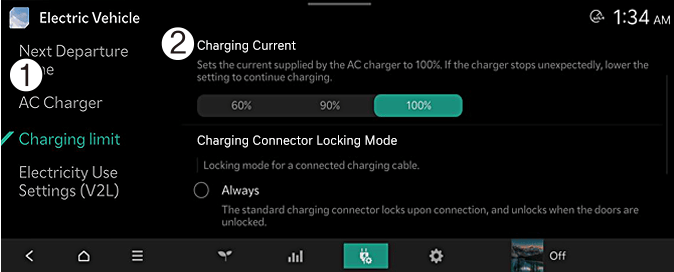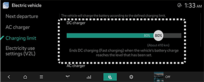 U slučaju nekih AC punjača velikog kapaciteta (punjača sa jačinom struje većom od one koju vozilo može da podnese), možda neće doći do promene struje punjenja čak i ako se postavka promeni.
