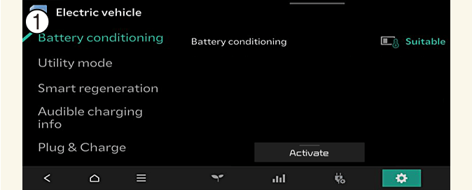 Ako je temperatura baterije niska tokom vožnje, režim kondicioniranja baterije podiže temperaturu baterije na odgovarajući nivo. Ako je temperatura baterije niska kada je aktivno zakazano aktiviranje klima-uređaja/grejača, ovaj režim se aktivira radi poboljšanja učinka vožnje i punjenja. Međutim, režim ne služi za osiguranje pređenog puta kada je nivo napunjenosti baterije nizak.