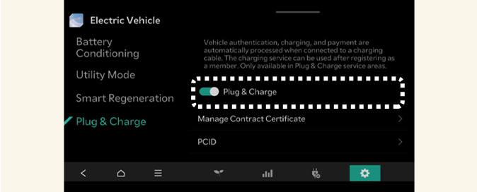 Kako biste omogućili funkciju Plug & Charge za automatsku naplatu tokom DC punjenja, odaberite EV → Podešavanje EV → Plug & Charge i omogućite Plug & Charge.