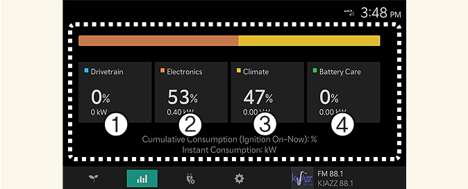 Elektronika prikazuje potrošnju snage i energije koju koriste sistemi vozila uključujući instrument tablu, infozabavni sistem (zvučnici i navigacija), svetla, kontrolna jedinica uređaja itd.