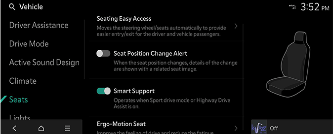 Ergo Motion sedište: Kada je aktiviran Ergo Motion, odabrani režim rada i informacije o radu biće prikazane zajedno sa slikom sedišta.