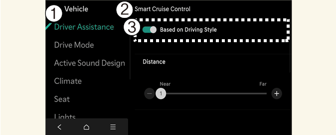 Ako vozilo ima funkciju Zasnovano na stilu vožnje, na ekranu infozabavnog sistema možete da izaberete Zasnovano na stilu vožnje odabirom stavki Podešavanje → Vozilo → Pomoć vozaču → Pametan tempomat.