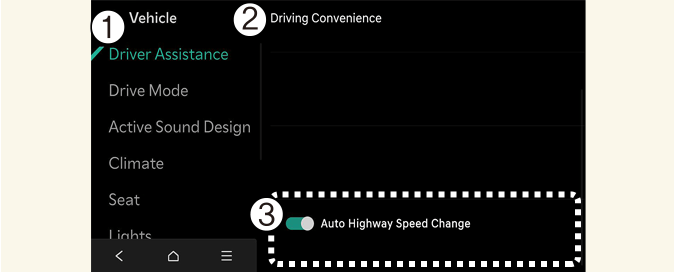 Kada je vozilo uključeno, na infozabavnom sistemu izaberite Podešavanja → Vozilo → Pomoć vozaču → Automatska promena brzine na autoputu.
