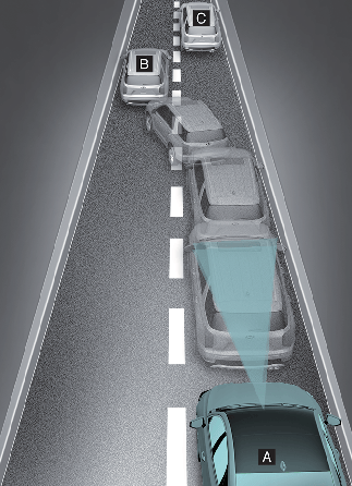 Kada se vozilo (B) ispred vas uključi u vašu traku, pomoć za izbegavanje čeonog sudara možda neće odmah prepoznati vozilo (C) koje je sada ispred vas. U tom slučaju, morate da održavate bezbedno rastojanje i da po potrebi promenite pravac i pritisnete papučicu kočnice kako bi se smanjila brzina i održalo bezbedno odstojanje.