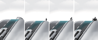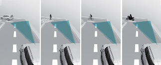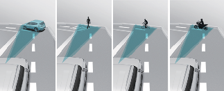 Gornja ilustracija prikazuje sliku koju kamera za prednji pogled i prednji radar mogu da otkriju kao vozilo, dvotočkaš, pešak i biciklist.