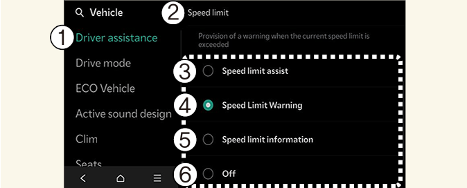 Pomoć za ograničavanje brzine: Inteligentna pomoć kod ograničene brzine će obavestiti vozača o ograničenju brzine i saobraćajnim znakovima, i upozoriće ga ako se vozilo kreće brže u odnosu na ograničenje brzine. Pored toga, inteligentna pomoć za ograničavanje brzine obavestiće vozača o promeni brzine zadate ručnim ograničavanjem brzine ili pametnim tempomatom kako bi mogao da održi zadatu brzinu(ako je u paketu opreme).