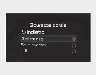 • Se si seleziona "Solo avviso", Assistenza mantenimento corsia avviserà il conducente con un avviso acustico e la vibrazione del volante (se in dotazione) quando viene rilevata un'uscita di corsia. Il conducente dovrà azionare lo sterzo.