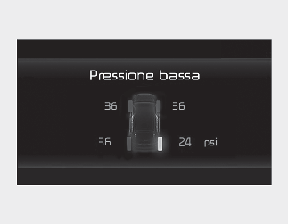 Quando gli indicatori spia del sistema di monitoraggio pressione pneumatici sono illuminati e viene visualizzato il messaggio spia sul display LCD quadro strumenti, vuol dire che uno o più pneumatici sono sotto-gonfiati in misura significativa. L'indicatore di pneumatico sgonfio segnala quale pneumatico è molto sgonfio accendendo la spia di posizione corrispondente.