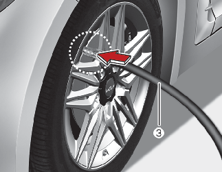 손상된 타이어의 휠 공기 주입구 캡을 풀어 「주입 호스」(3)를 휠 공기 주입구에 연결하여 고정하십시오.