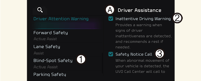 Cu vehiculul pornit, selectați sau deselectați Setări → Vehicul → Asistență șofer → DAW (Avertizare atenție șofer) în ecranul sistemului de infotainment pentru a seta dacă folosiți sau nu fiecare funcție.