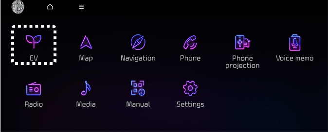 Si selecciona el menú EV en la pantalla de inicio del sistema multimedia o presione el botón EV en el lado izquierdo del botón de comando de entrada de aire, puede ingresar al menú EV.