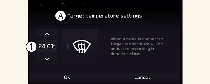 Si se define la temperatura objetivo (1) con el cable conectado, se ajustará la temperatura del habitáculo a temperatura objetivo para la hora de salida. En condiciones ambientales frías, la calefacción programada ayuda a mejorar el rendimiento del vehículo eléctrico al calentarlo con anterioridad.
