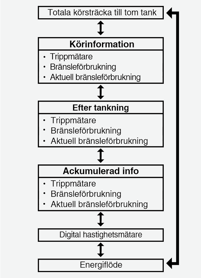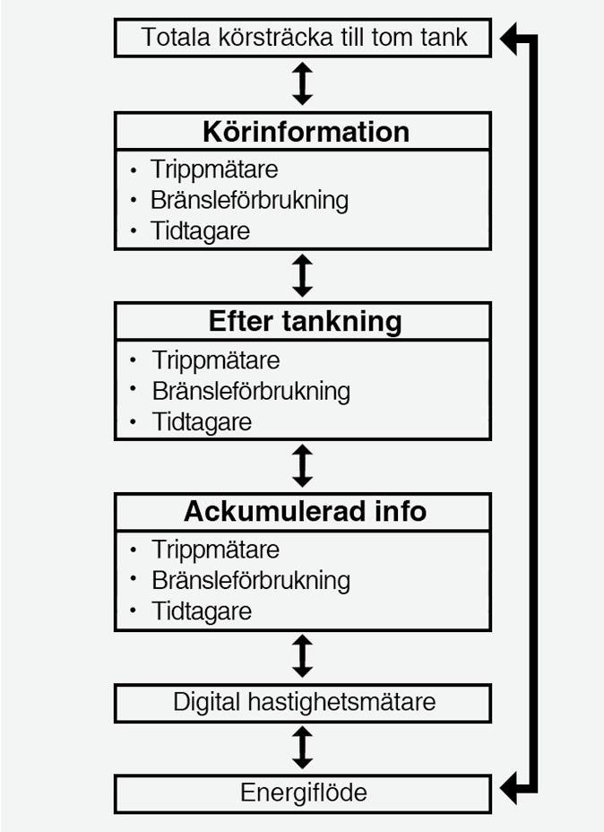 Denna display visar den ackumulerade färdsträckan (1), den genomsnittliga bränsleeffektiviteten (2), den aktuella bränsleförbrukningen (3) och total körtid (4) efter tankning.