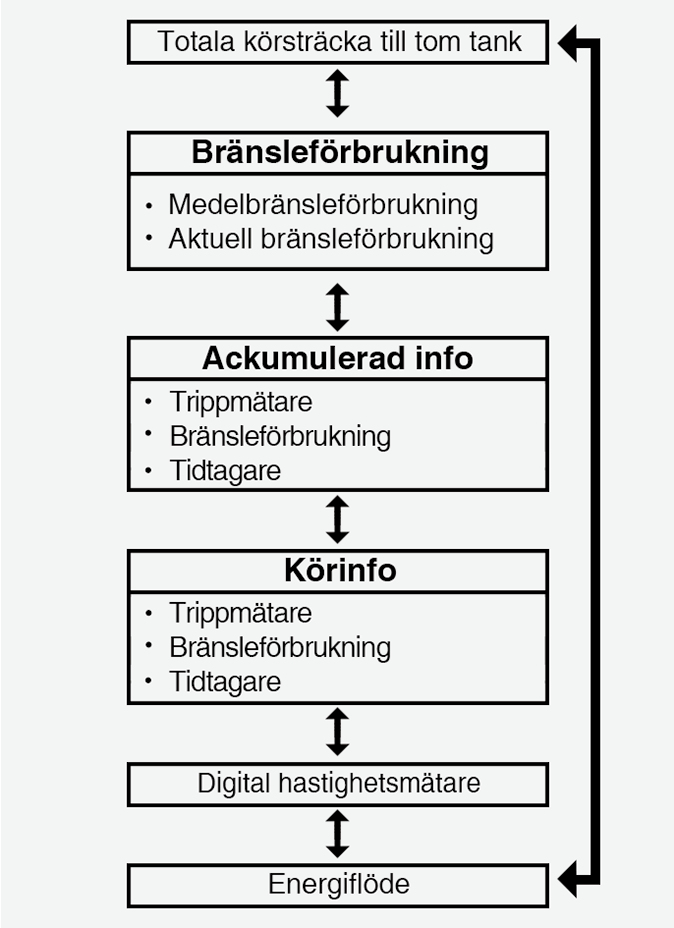Denna display visar färdsträckan (1), genomsnittlig bränsleförbrukning (2) och total körtid (3) informationen uppdateras en gång per tändcykel.