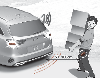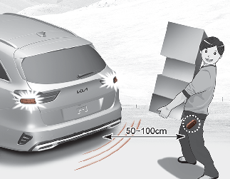 Om du befinner dig inom avkänningsområdet (50 -100 cm bakom bilen) och har smartnyckeln med dig blinkar varningslamporna och ett ljud hörs i ungefär 3 sekunder för att upplysa om att smartnyckeln har känts av och att bakluckan öppnas.