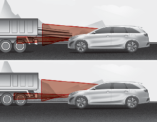 Om framförvarande fordon har tung last som sticker ut bakåt eller om det har hög markfrigång kan det uppstå riskfyllda situationer. Uppmärksamma alltid väg- och körförhållanden under färd och tryck ned bromspedalen vid behov för att sänka körhastigheten för att bibehålla avståndet.
