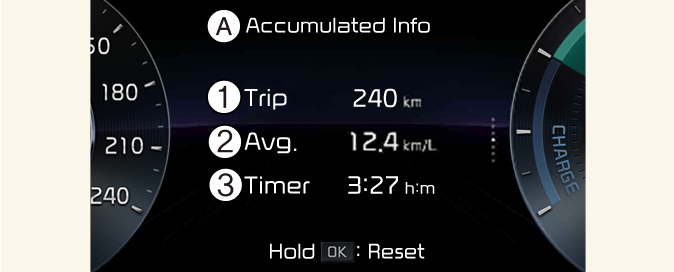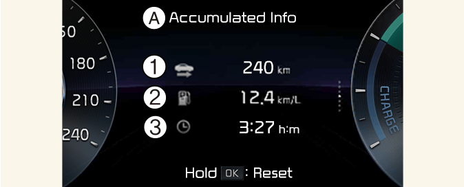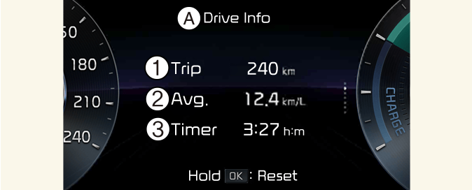 Щоб вручну скинути інформацію, натисніть і утримуйте натиснутою кнопку OK на кермі, коли відкрите вікно інформації для водія (Drive info).