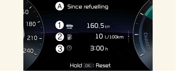 Щоб вручну скинути інформацію, натисніть і утримуйте натиснутою кнопку OK на кермі, коли відкрите вікно Після останньої заправки.