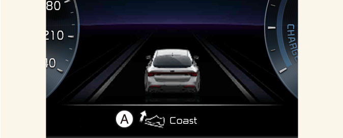 Пролунає звуковий сигнал і засвітиться індикатор режиму руху накатом для інформування водія про те, коли слід зняти ногу з педалі акселератора для сповільнення* залежно від аналізу маршрутів руху й дорожніх умов, збережених у системі навігації. Вона інформує водія про необхідність зняти ногу з педалі й дозволити автомобілю рухатися накатом зі схилу лише на двигуні електромобіля. Це допомагає попередити надлишкову витрату палива й підвищити ефективність споживання палива. * Приклад ситуації, коли треба сповільнитися: з'їзд з довгого схилу, сповільнення перед пунктом оплати й наближення до ділянок із обмеженням швидкості.