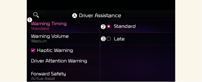 Звичайний: Використовуйте за звичайних дорожніх умов. Якщо функція занадто чутлива, установіть час виведення попередженняПізній.
