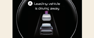 Коли автомобіль попереду від’їжджає від зупинки, система попередження про початок руху автомобіля попереду повідомить водія за допомогою відображеного на панелі панелі приладів попереджувальне повідомлення і пролунає звукове попередження.