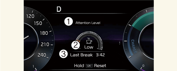 Рівень уваги водія відображається за шкалою від 1 до 5. Що нижче рівень, то менш уважний водій. Рівень зменшується, коли водій не здійснює зупинок протягом певного періоду під час їзди.